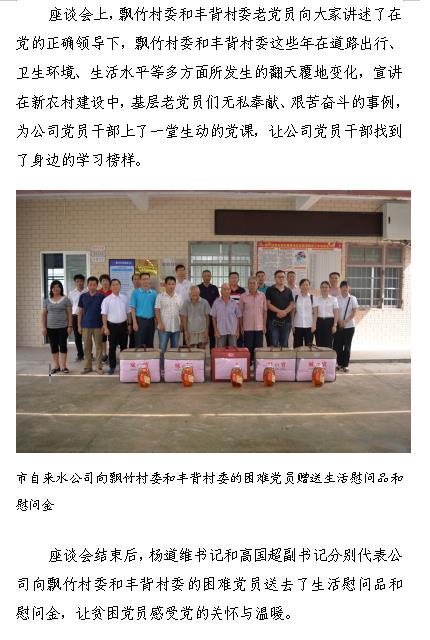 座谈会结束后,杨道维书记和高国超副书记分别代表公司向飘竹村委和丰背村委的困难党员送去了生活慰问品和慰问金,让贫困党员感受党的关怀与温暖。