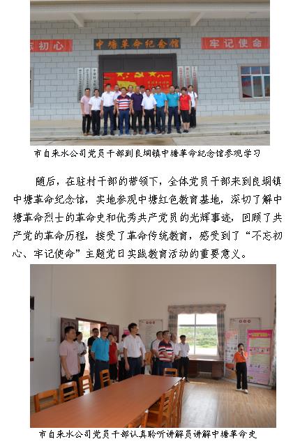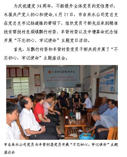 为庆祝建党98周年,不断提升全体党员的党性意识,永葆共产党人初心和使命,6月27日,市自来水公司党总支在党总支书记杨道维的带领下,组织党员干部先后来到精准扶贫帮扶村良垌镇飘竹村委、丰背村委以及中塘革命纪念馆开展“不忘初心、牢记使命”主题党日活动。