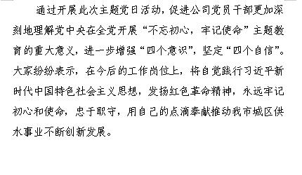 通过开展此次主题党日活动,促进公司党员干部更加深刻地理解党中央在全党开展“不忘初心,牢记使命”主题教育的重大意义,进一步增强“四个意识”,坚定“四个自信”。大家纷纷表示,在今后的工作岗位上,将自觉践行习近平新时代中国特色社会主义思想,发扬红色革命精神,永远牢记初心和使命,忠于职守,用自己的点滴奉献推动我市城区供水事业不断创新发展。