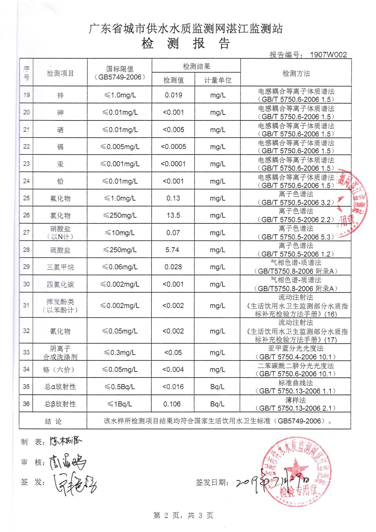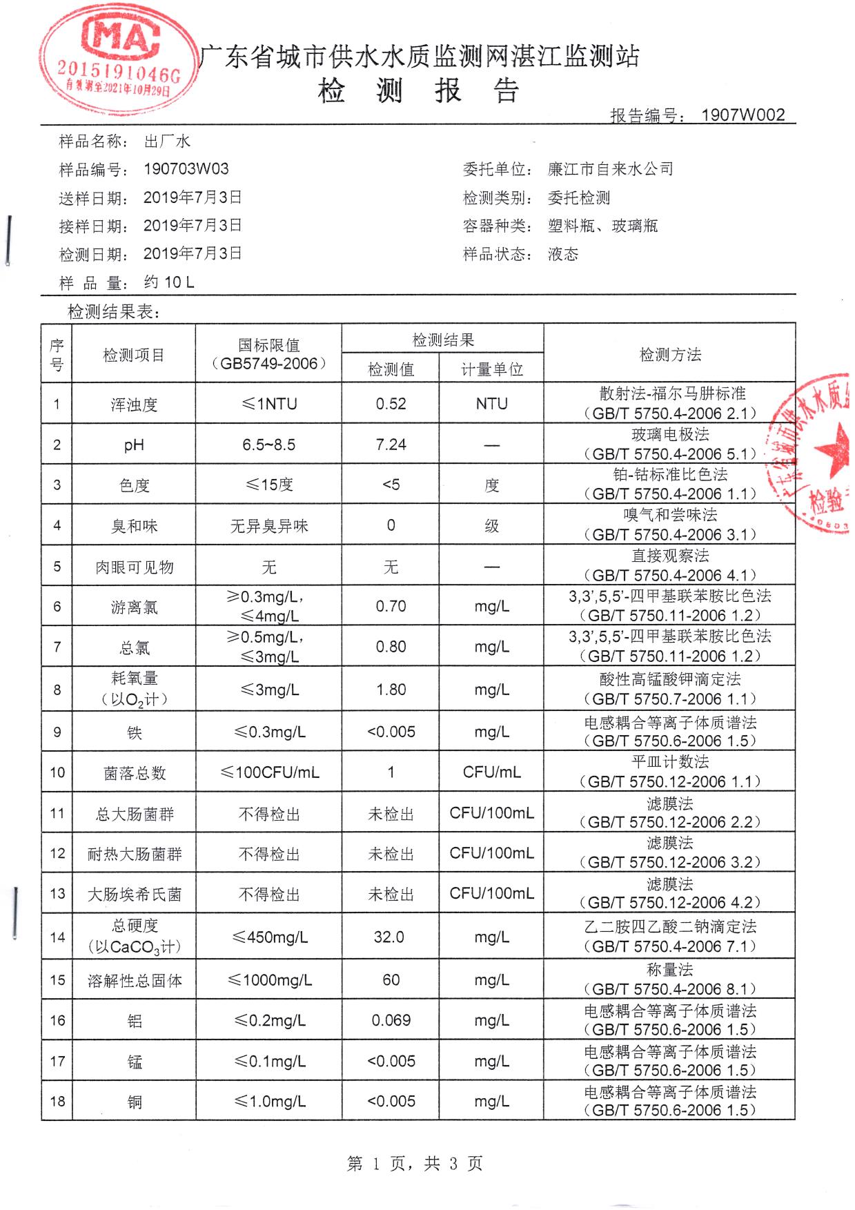 廉江市自来水有限公司出厂水检验数据(