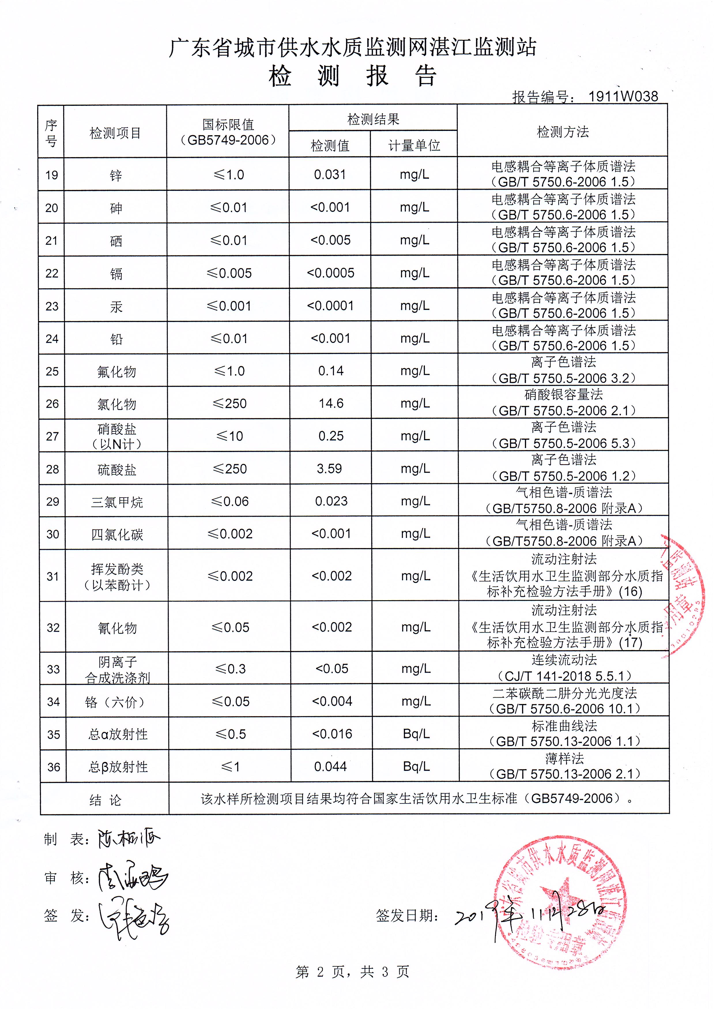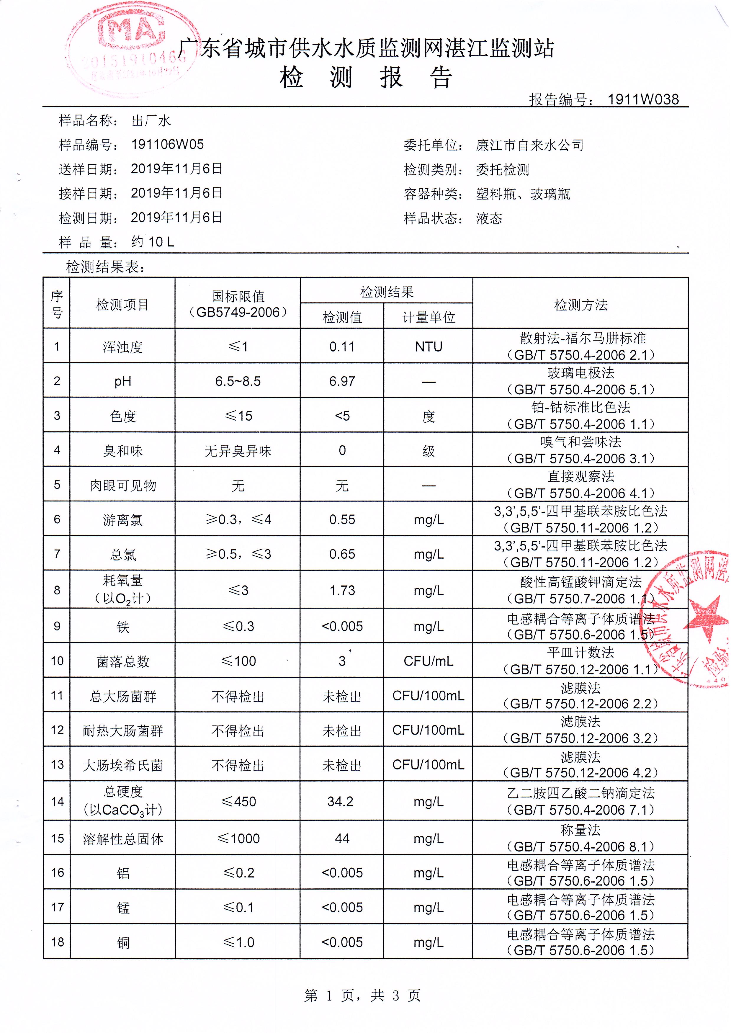 广东省城市供水水质监测网湛江监测站检测报告 2019年11月份