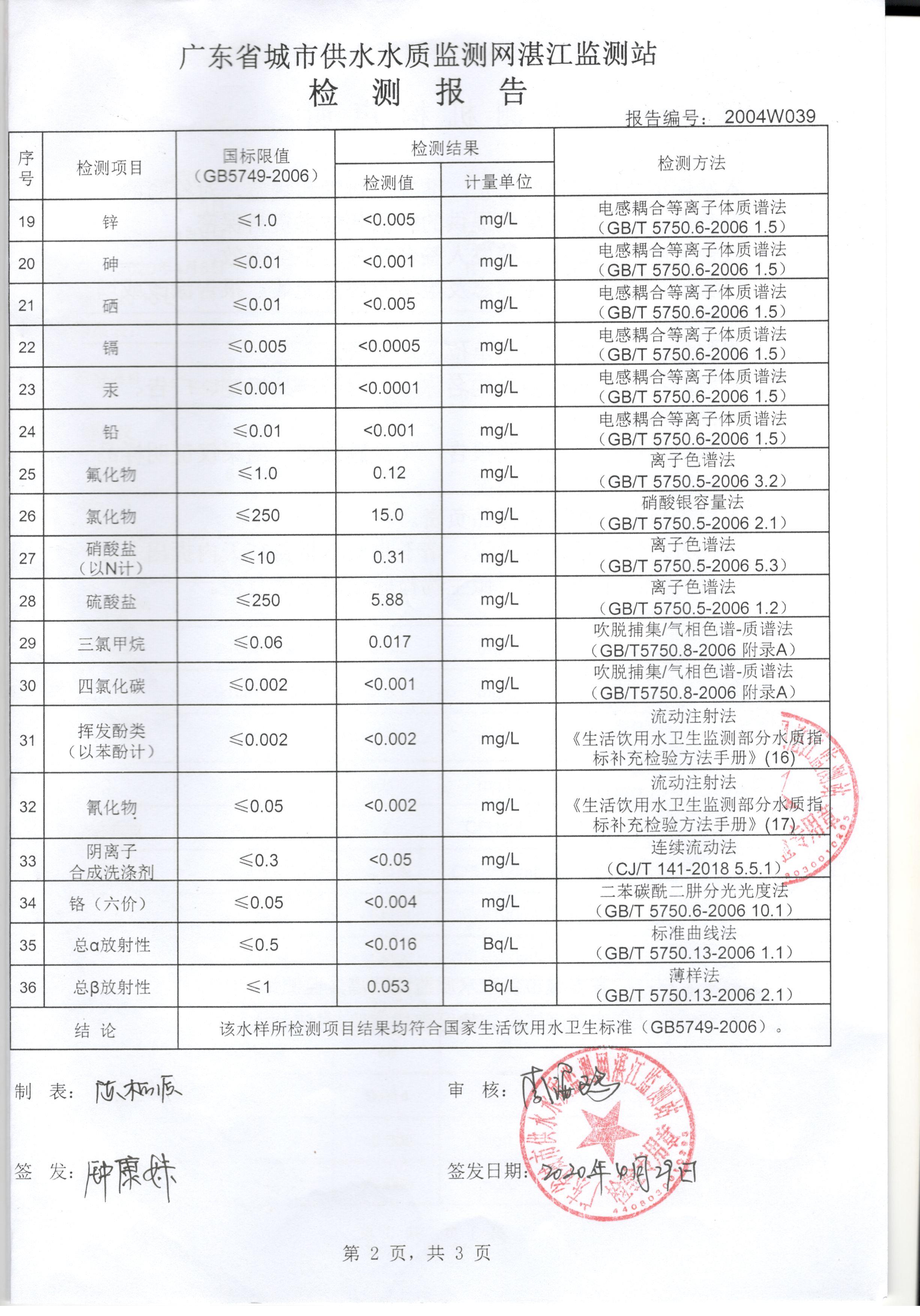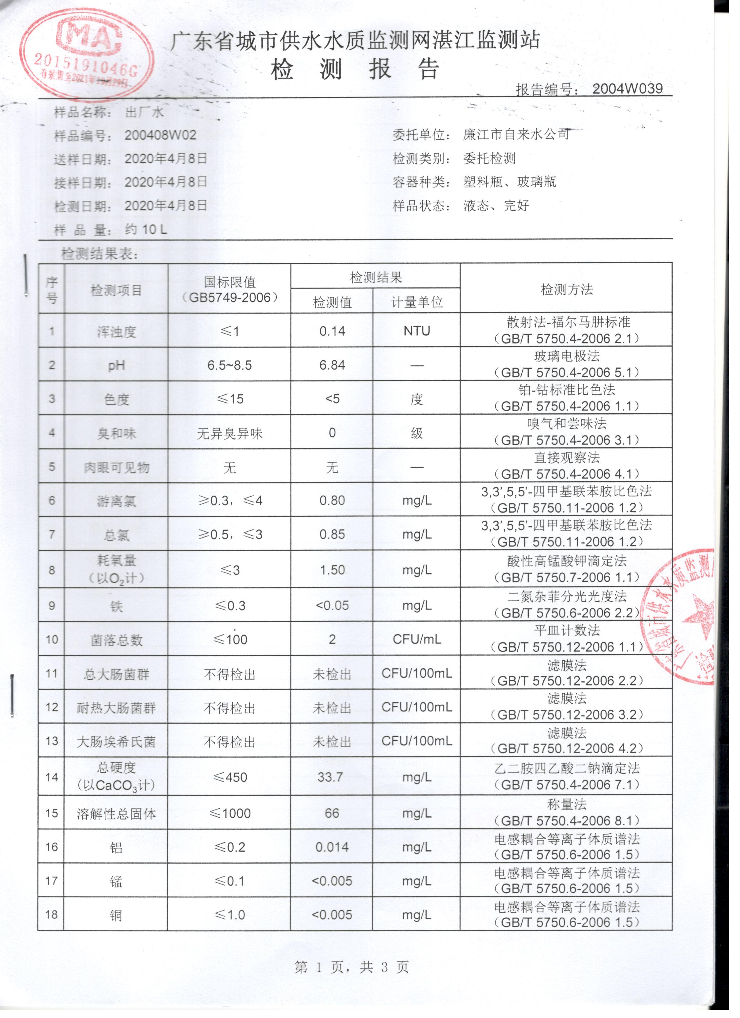广东省城市供水水质监测网湛江监测站检测报告 2020年4月份